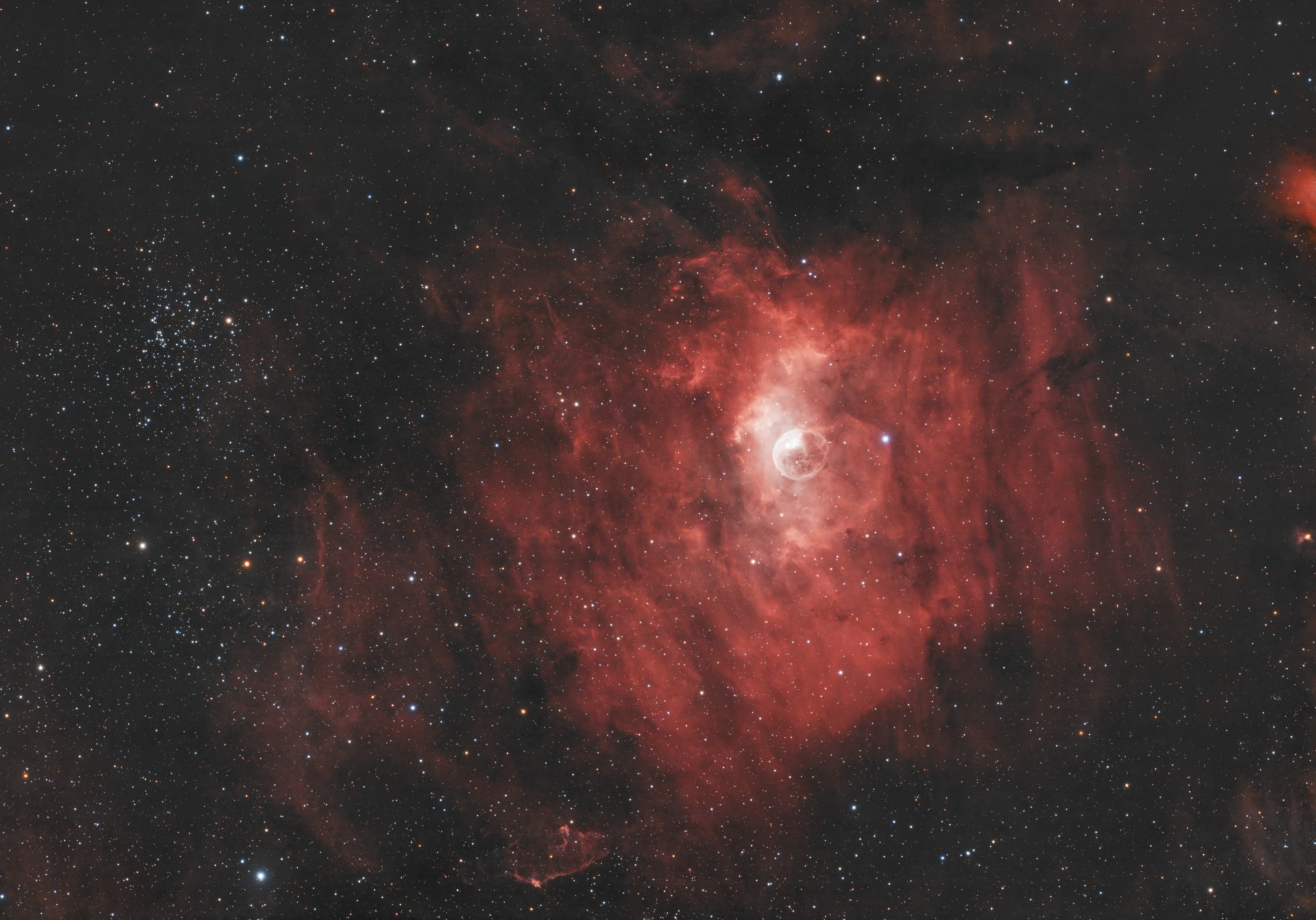 The nebula’s defining feature, the bubble, is created by the intense stellar wind from BD+60°2522. This high-speed flow of charged particles blows the surrounding interstellar medium outward, forming a spherical shell of ionized gas. The Bubble Nebula has an apparent size of about 15 by 8 arcminutes, corresponding to a physical diameter of around 6 to 7 light-years across. The material within the nebula is predominantly hydrogen, though traces of heavier elements such as oxygen, nitrogen and sulphur are also present, excited to emit light through photoionization processes. The structure is particularly luminous in emission lines such as H-alpha, which astronomers use to trace the distribution of ionized hydrogen gas.