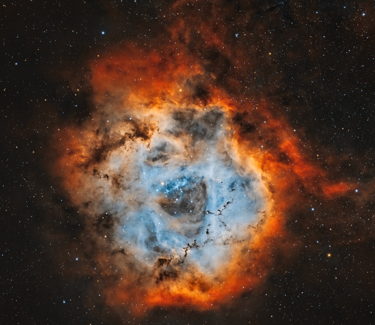 The nebula’s striking, rose-like appearance results from the powerful radiation and stellar winds from NGC 2244, which have sculpted a central low-density cavity. These winds have cleared out the gas and dust in the centre, forming a roughly circular void surrounded by a shell of ionized material.