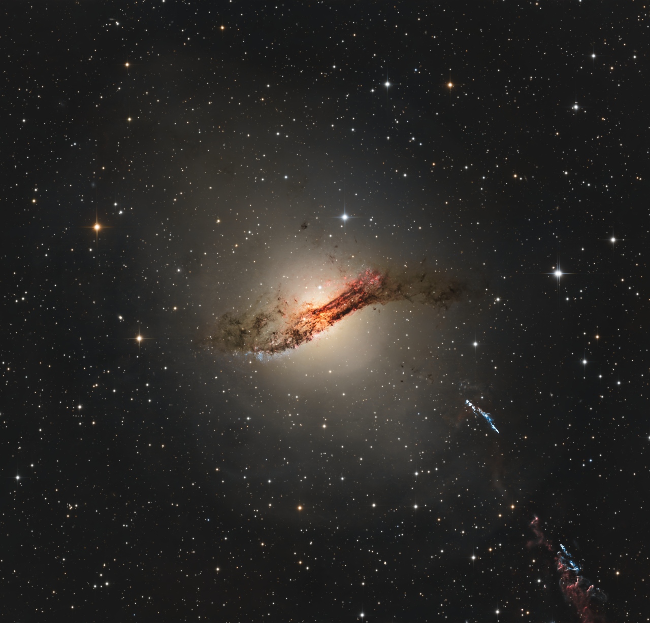 Floating just 12 million light-years away in the southern skies lies one of the most extraordinary galaxies in our cosmic neighbourhood, Centaurus A. Also known as NGC 5128, this peculiar galaxy is unlike any of the classic spiral or elliptical forms we typically associate with galactic structure. It’s a cosmic hybrid, an elliptical galaxy that has visibly swallowed a smaller spiral one, creating a spectacular result: a massive, bright galactic core sliced by a thick, dark band of dust and glowing gas.