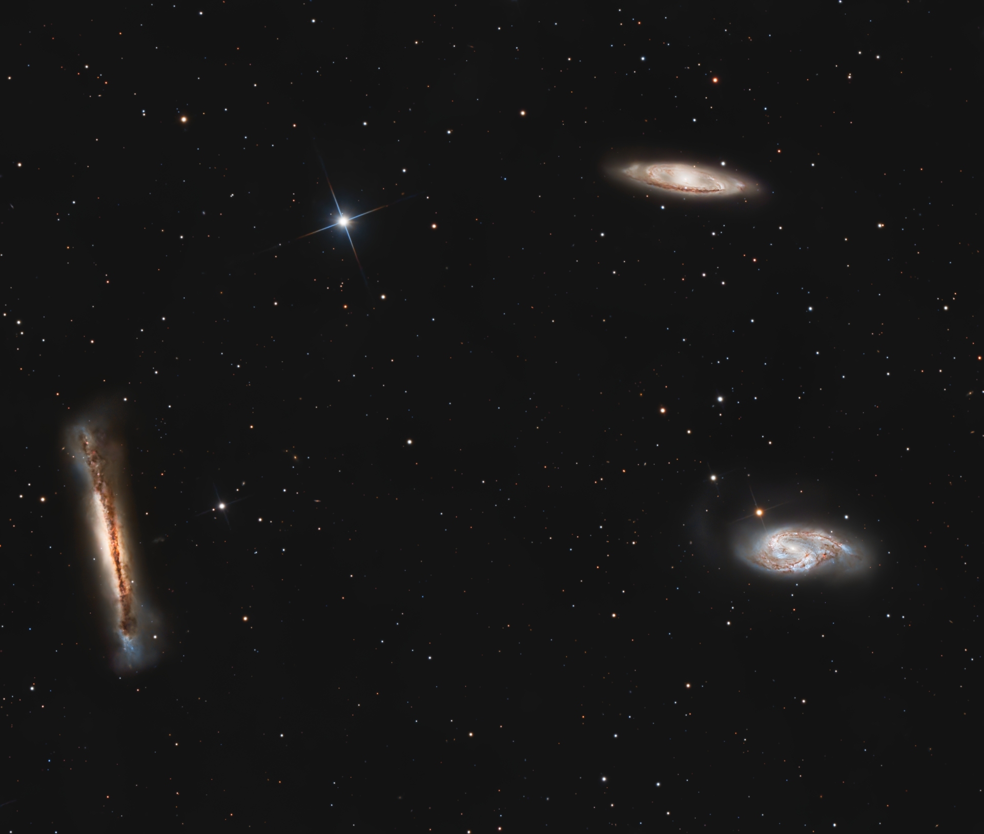 Messier 65 and Messier 66 were discovered by Charles Messier on 1 March 1780, during his effort to catalogue nebulous objects that might be mistaken for comets. NGC 3628 was later observed by William Herschel on 8 April 1784. While initially documented based on visual observations, subsequent redshift and distance measurements have confirmed that all three galaxies are physically associated and gravitationally bound. Each displays distinct spiral structures, but all bear the hallmarks of past dynamical interactions.