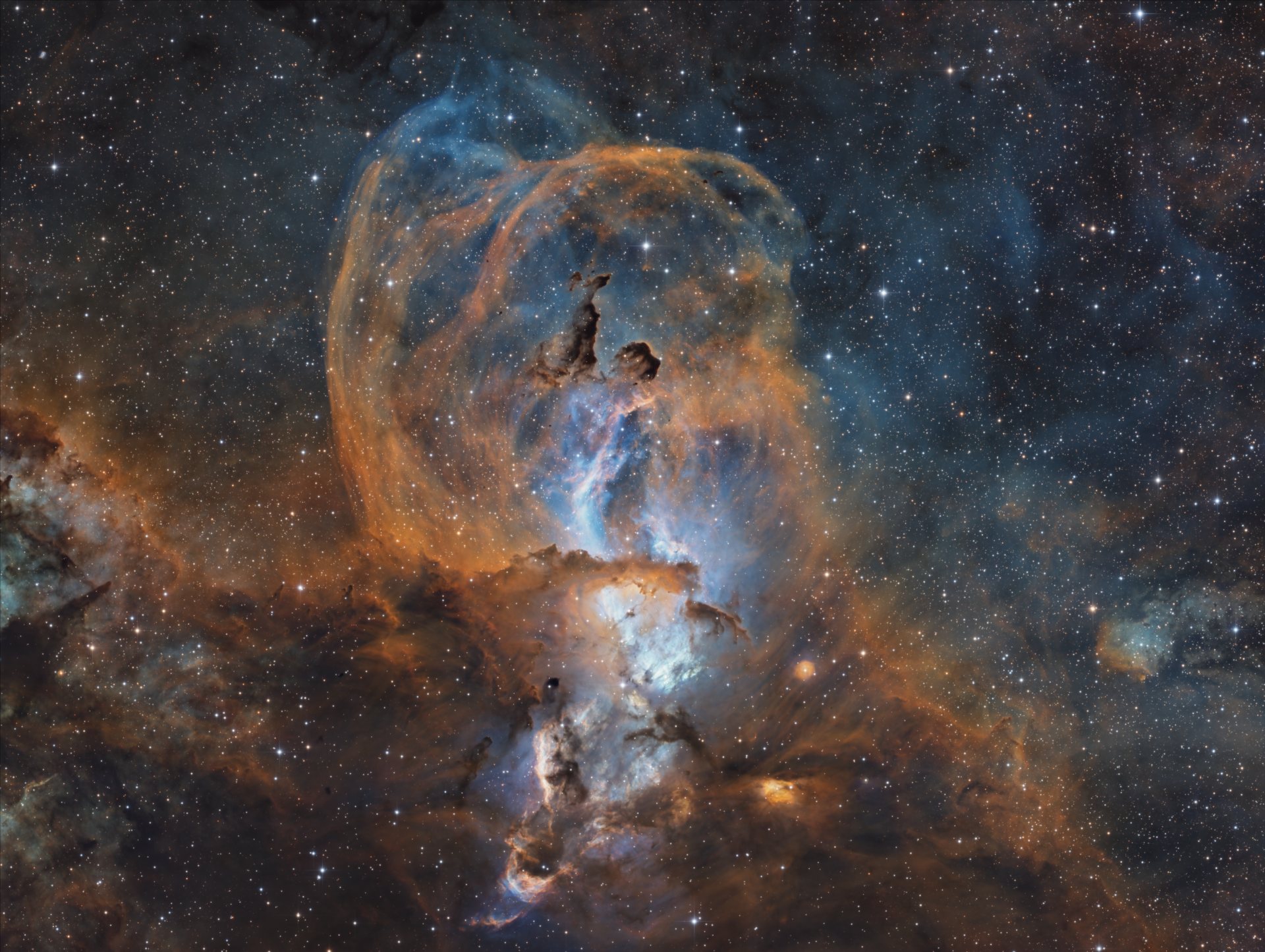 Adding to the region's intrigue are numerous Bok globules: compact, opaque clouds of gas and dust silhouetted against the bright emission backdrop. These are believed to be embryonic star-forming clumps, where conditions may eventually lead to gravitational collapse and the birth of protostars.