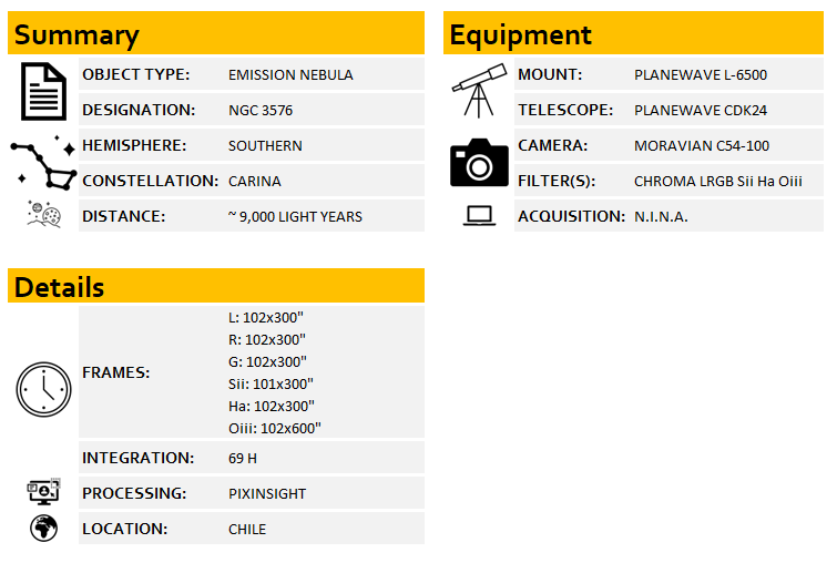 NGC 3576 is classified as an H II region, a type of emission nebula formed from vast clouds of ionised hydrogen gas. These clouds are energised by ultraviolet radiation emitted by newly formed, massive OB-type stars, causing the gas to glow brightly in visible wavelengths. The intense radiation, along with powerful stellar winds, sculpts the interstellar medium, carving cavities and driving shock waves through surrounding material. “Massive stars profoundly influence their environment, generating powerful winds and ionising radiation that shape the evolution of star-forming regions.” (NASA, Chandra X-ray Center). Spanning nearly 100 light-years across and appearing about 35 by 15 arcminutes in the sky, NGC 3576 is one of the most prominent features in southern sky surveys.