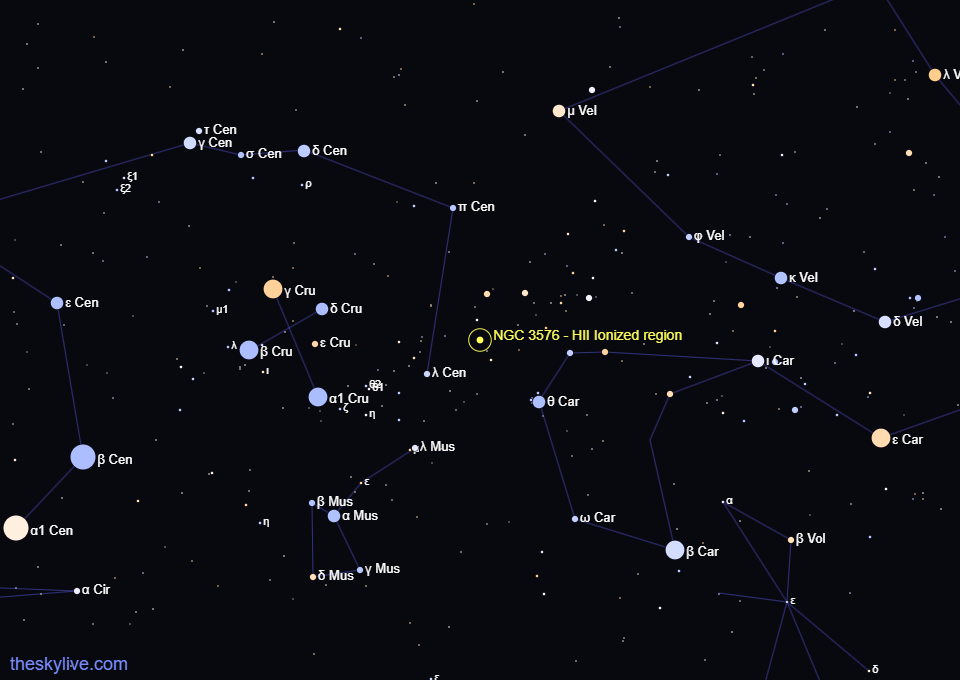 NGC 3576 is a favourite among astrophotographers and observers located in the Southern Hemisphere, where it appears high in the night sky during the late summer and autumn months. Situated in the Carina constellation, it lies near celestial landmarks such as Eta Carinae and the Carina Nebula complex, a rich region of interstellar wonder.